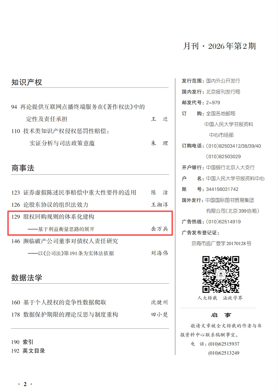 近日,必威西汉姆联副教授岳万兵所著论文《股权回购规则的体系化建构——基于利益衡量思路的展开》被《人大报刊复印资料》2026年第2期全文转载,该文原载于《比较法研究》2025年第6期。