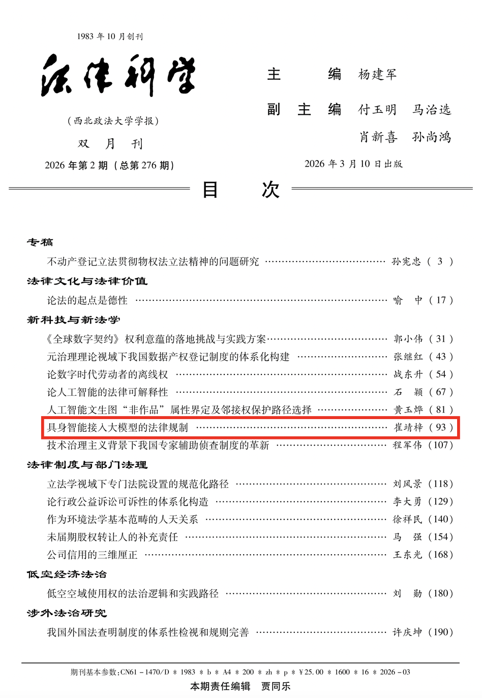 摘要:大模型与具身智能的融合标志着人工智能从代码构建的虚拟空间向现实世界的跨越式演进,使具身智能具备环境感知、认知交互、决策制定和行动控制等综合能力。这种功能突破引发了区别于离身智能的人身与财产安全风险、隐私侵害加剧风险以及算法歧视具身化等法律风险。但是,传统人工智能规制中的“人在回路”逻辑、分级分类框架、监管沙盒机制等在应对此新型风险时表现出明显的效能衰减与适应性不足。因此,有必要以“规制理念—规制路径”为逻辑主线,对传统的人工智能法律规制方法进行调整。应当采用面向训导主义的“人机共生”规制理念,以人机关系为整体考量,对人机交互进行程序控制,推动多主体协同;构建基于“关键—基础”二分的精准化规制框架,运用动态认证机制对监管沙盒进行补足,从而形成兼具灵活性与安全性的法律规制体系。