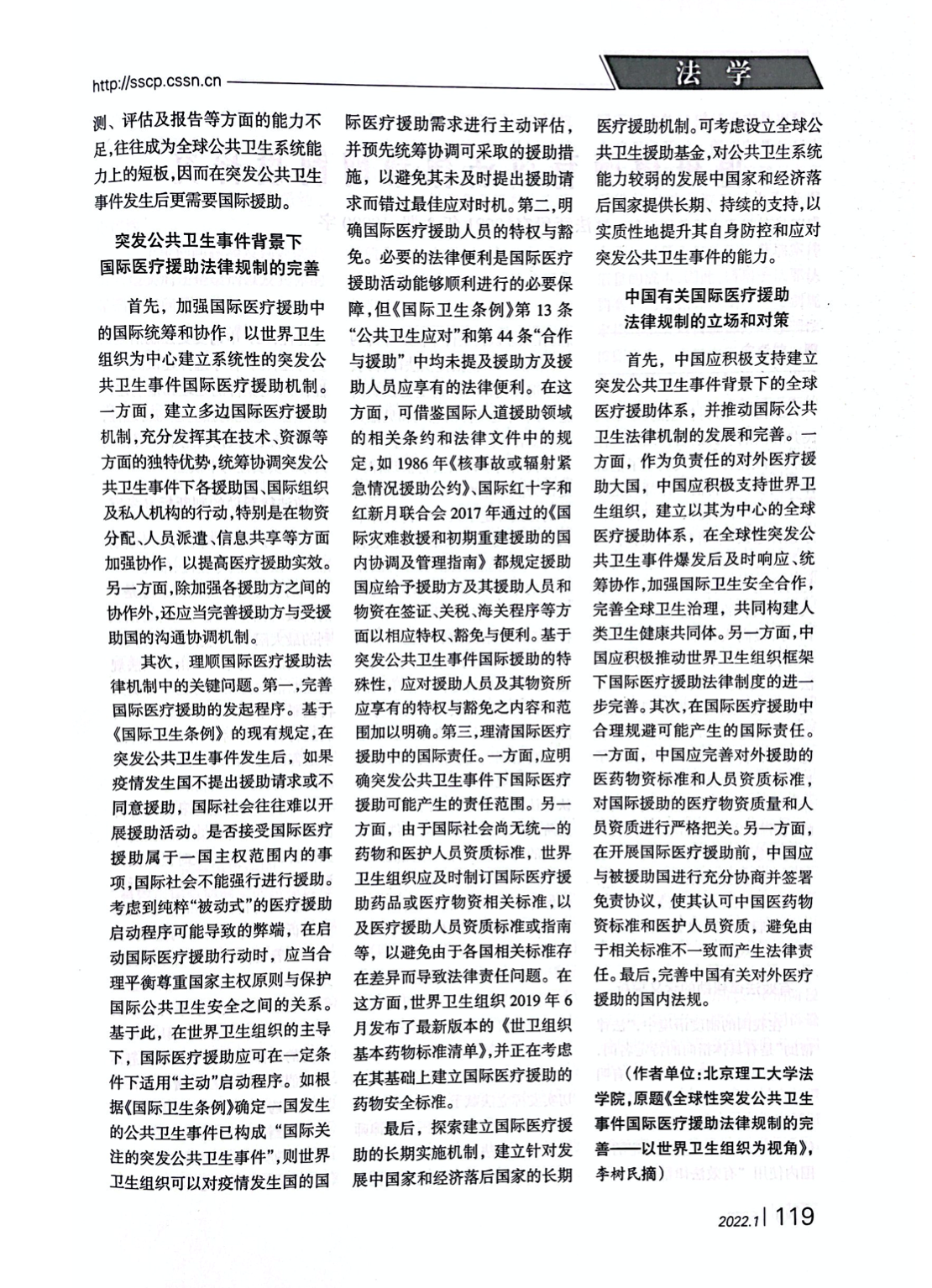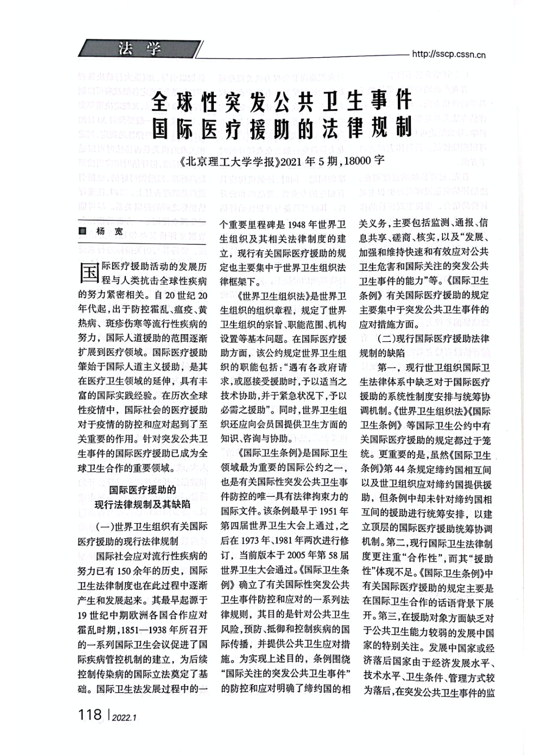 近日,必威西汉姆联青年教师杨宽所著论文《全球性突发公共卫生事件国际医疗援助的法律规制》被《中国社会科学文摘》2022年第1期转载。