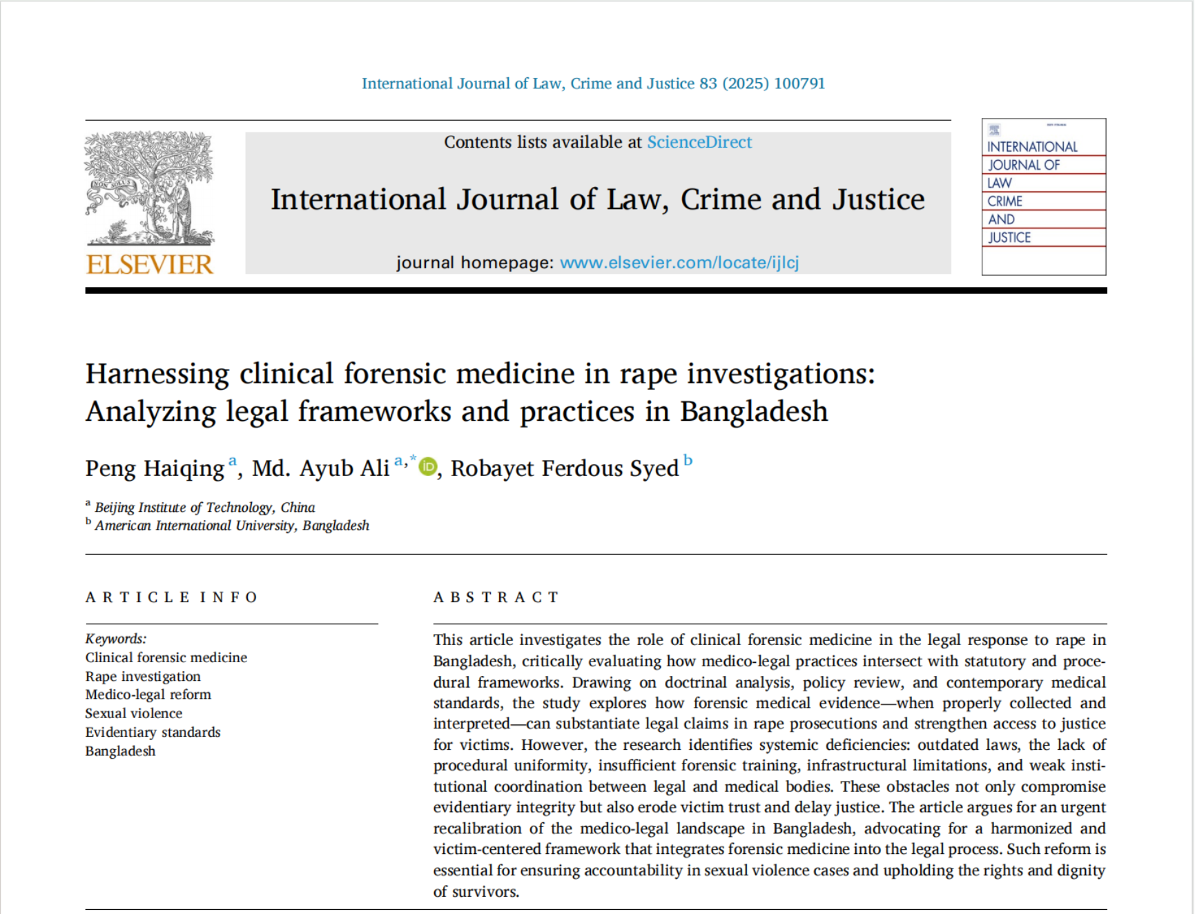 摘要:本文探讨了临床法医学在孟加拉国应对强奸案中的作用,批判性地评估了医疗法律实践与法定和程序框架的交叉情况。通过学说分析、政策审查和当代医学标准,该研究探讨了当法医医学证据得到妥善收集和解读时,如何在强奸案的起诉中证实法律主张,并增强受害者获得正义的机会。然而,研究发现存在系统性缺陷:法律过时、缺乏程序统一性、法医培训不足、基础设施有限以及法律和医疗机构之间协调薄弱。这些障碍不仅损害了证据的完整性,还削弱了受害者的信任,拖延了正义的实现。文章主张孟加拉国应紧急调整医疗法律环境,倡导建立一个协调一致且以受害者为中心的框架,将法医学融入法律程序。这样的改革对于确保性暴力案件中的问责制以及维护幸存者的权利和尊严至关重要。