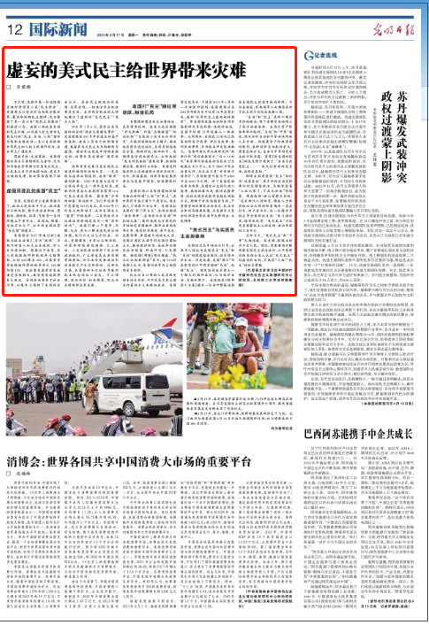 不久前,美国纠集一批追随国家组织所谓第二届“民主峰会”。美国再次以意识形态划线分裂世界,亵渎和践踏民主精神,充分暴露了其一直以来“假民主真霸权”的霸道心态。美国一些政客自诩的民主灯塔,以及投入巨大资源包装美化的“民主、自由、人权”国家形象和美国政府一直以来在践踏世界民主和人权上的胡作非为,在世界上广遭厌弃。