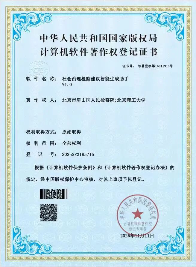 喜报|北理工必威西汉姆联智慧法治实验室与房山区检察院联合研发“社会治理检察建议智能生成助手”成功取得软件著作权