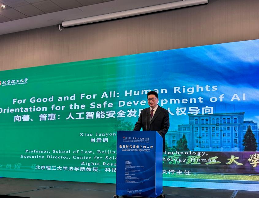 我院教授、科技人权研究中心执行主任肖君拥在主旨发言环节作了题为《向善、普惠:人工智能安全发展的人权导向》的报告。肖教授列举了中国在教育、医疗、司法等领域应用人工智能技术的生动案例,表明了中国实践既造福了偏远基层地区,也助力了发展中国家的生产生活,展示了中国“以人民为中心”的人工智能安全发展治理理念,和拒绝技术霸权而倡导协同合作的立场。应坚持“技术向善、人权普惠”价值导向,将技术逻辑与人权伦理深度融合,人工智能方能行稳致远。