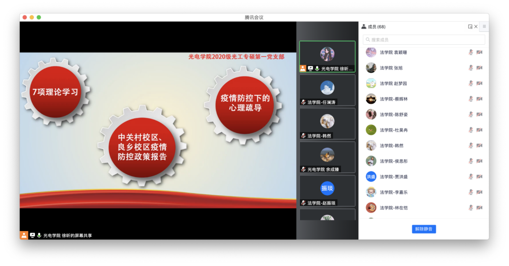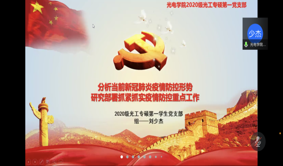 首先,由光电学院光工专硕党支部成员讲授理论学习内容。学习内容包括:中央政治局常委会召开会议,分析当前新冠肺炎疫情防控形势,研究部署抓紧抓实疫情防控重点工作、习近平给中国航天科技集团空间站建造青年团队的回信等。