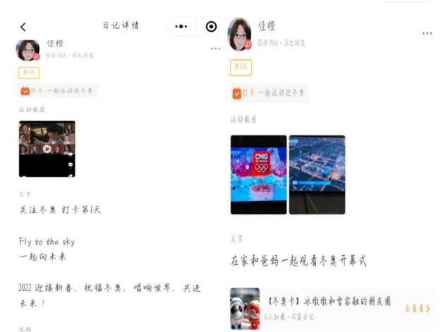 冬奥经历:寒假期间,身在家乡江西的李佳橙同学虽与北京相隔千里,但她也在以自己的方式为北京冬奥会助力,为中国奥运健儿们加油。她在“小打卡”微信小程序中将自己每日观看冬奥赛事的情况与他人分享,希望带动大家一起关注这场冰雪盛事,尽微薄之力宣传冬奥知识。