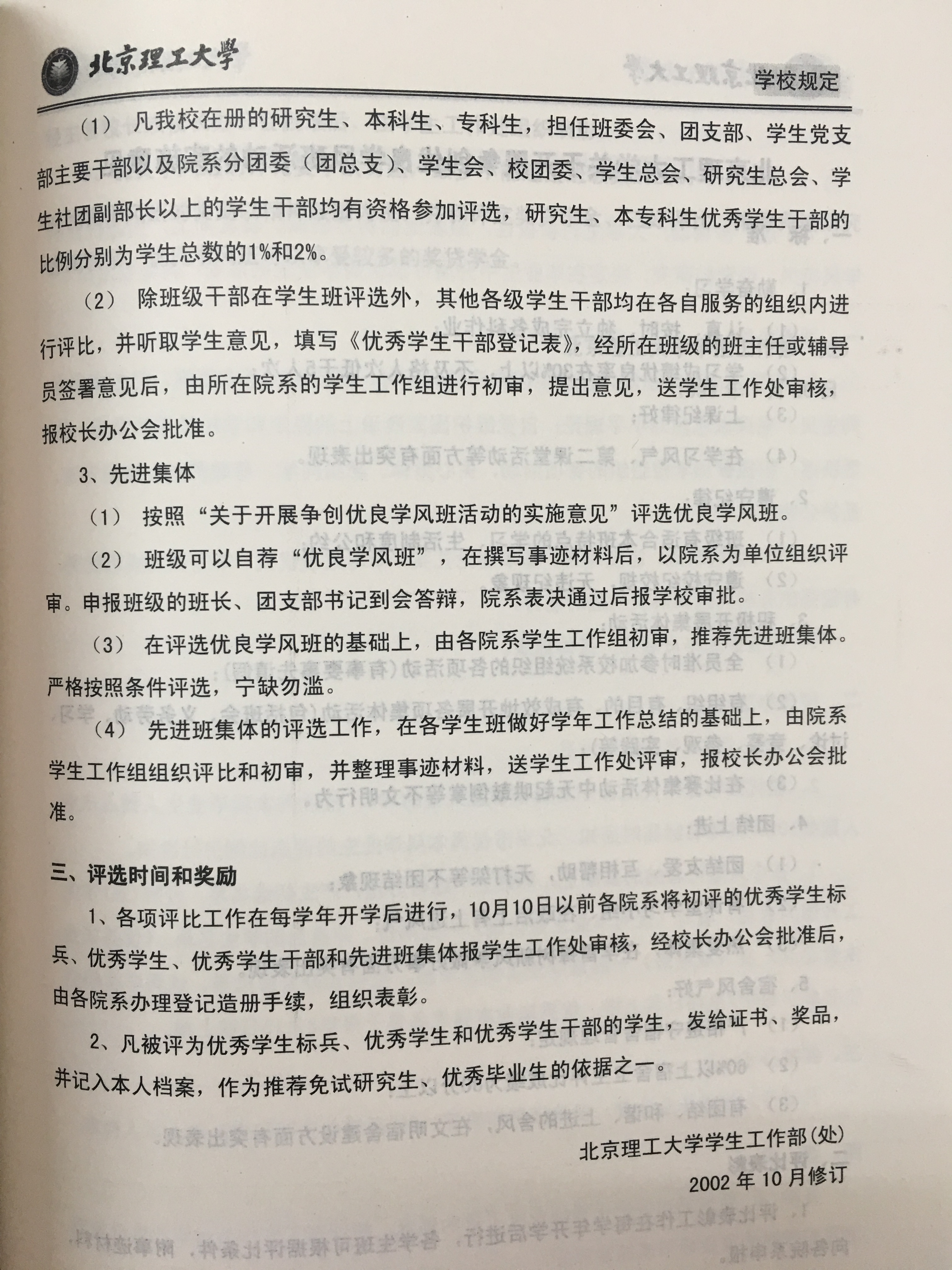 1、本科生认真阅读学生手册中《BETWAY必威关于评选优秀学生、优秀学生干部和先进班集体的规定》,研究生认真阅读《北京理工大学关于评选优秀研究生、优秀研究生干部和优秀研究生班集体、优秀研究生学术创新团队的规定》(附件1)。在确定自己相关条件符合要求的基础上,方可进行申报。