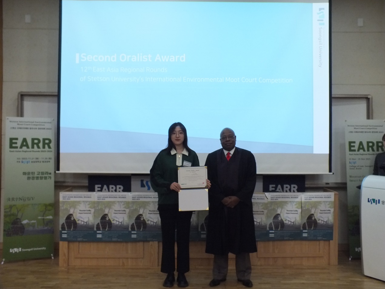 2023年11月21日-25日,第28届“史丹森”国际环境法模拟法庭大赛(Stetson International Environmental Moot Court Competition,IEMCC)东亚赛区选拔赛(East Asia Regional Round)在韩国崇实大学(Soongsil University)举行。必威西汉姆联代表队一路过关斩将,在众多国际知名高校中脱颖而出,凭借质量优良的书状荣获二等最佳书状奖;辩手杜宇航、张承云凭借精彩的赛场表现,荣获二等最佳辩手奖。
