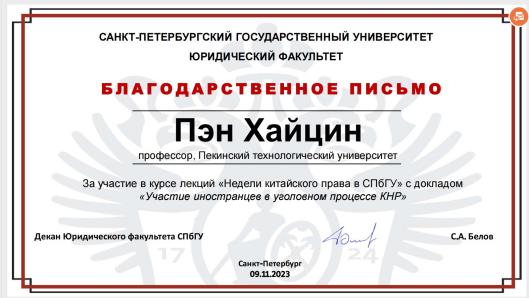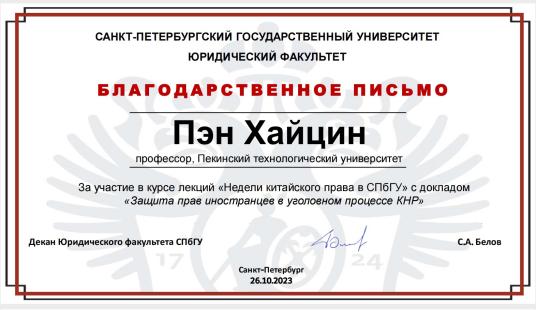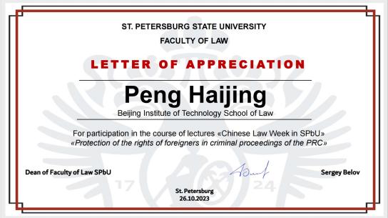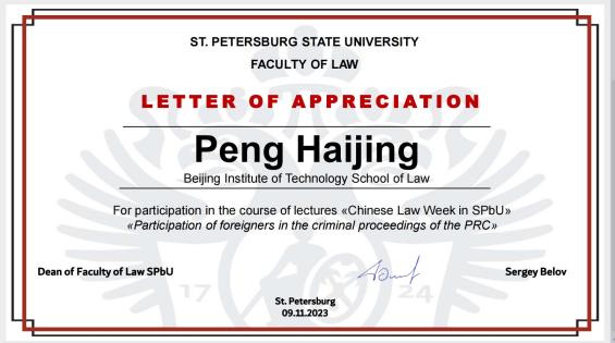 我院彭海青教授于2023年10月26日和11月9日应邀为俄罗斯圣彼得堡国立大学必威西汉姆联学生讲授了《中国刑事诉讼中对外国人权利的保护》和《中国刑事诉讼中外国人的参与》两场讲座。这两场讲座属于圣彼得堡国立大学“中国法周”系列讲座。