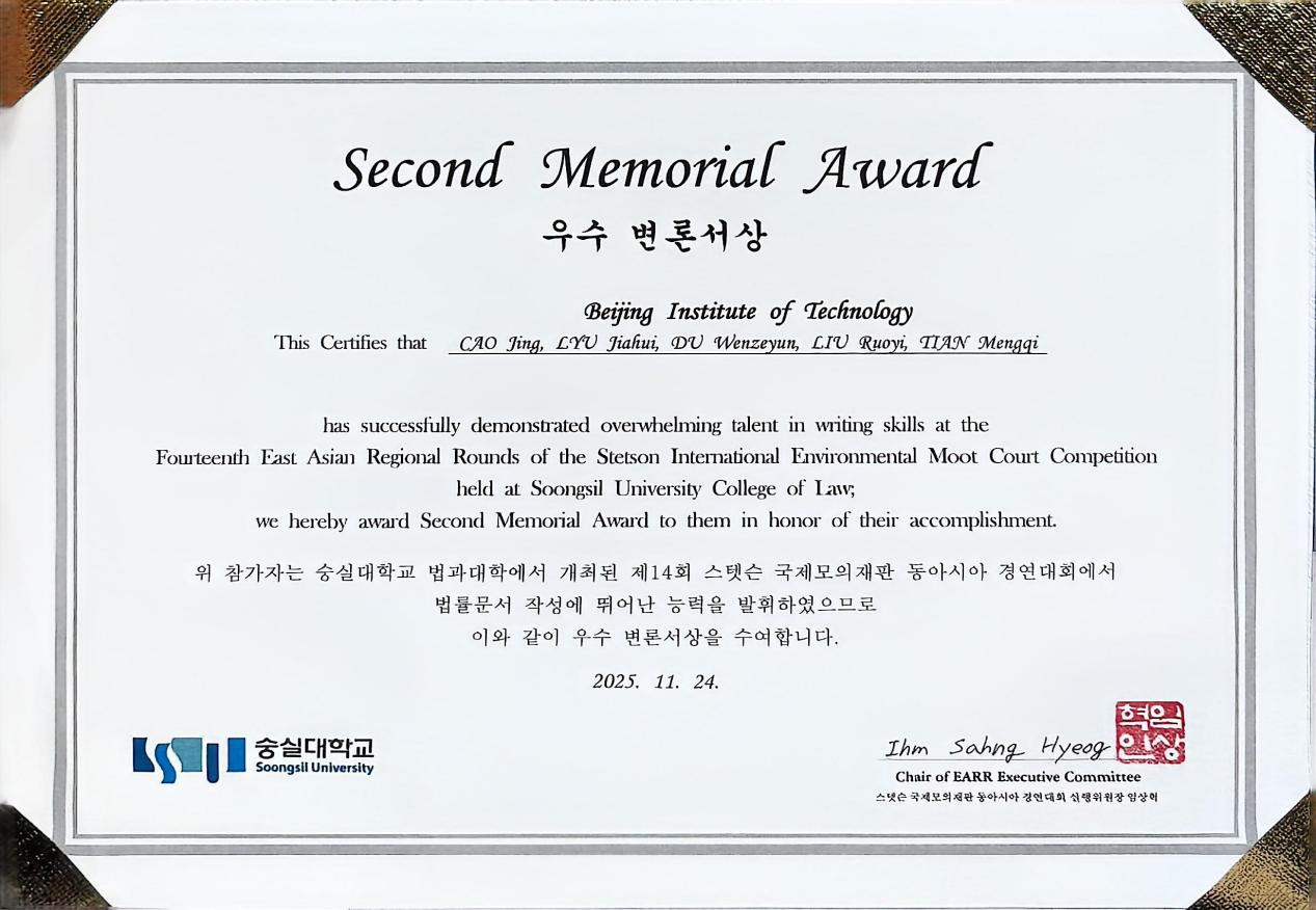2025年11月20日-24日,第30届“史丹森”国际环境法模拟法庭大赛(Stetson International Environmental Moot Court Competition,IEMCC)东亚赛区选拔赛(East Asia Regional Round) 在韩国崇实大学(Soongsil University)举行。北理工必威西汉姆联代表队在众多国际知名高校中脱颖而出,凭借逻辑清晰、质量优良、准备充足的书状荣获“最佳书状二等奖”。