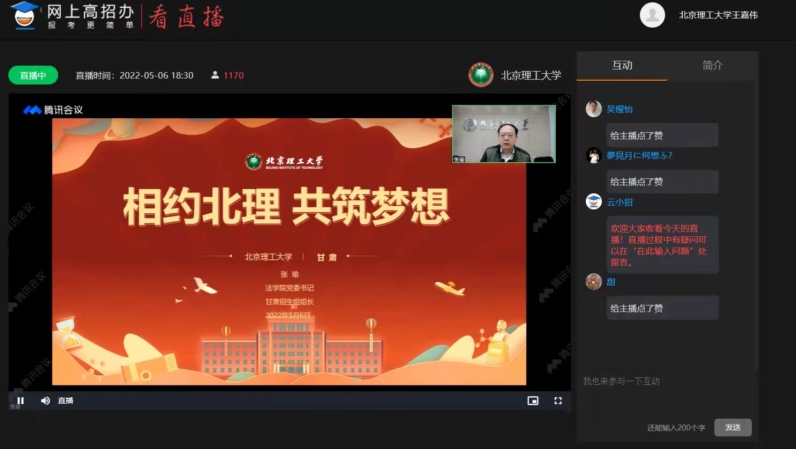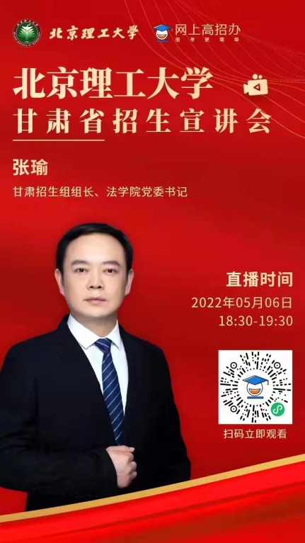 5月6日晚,甘肃招生组举办了2022年甘肃省招生宣讲会。甘肃招生组组长张瑜、副组长马晓龙共同通过网上高招办平台与考生和家长见面和答疑,约4000名家长、考生在线观看。