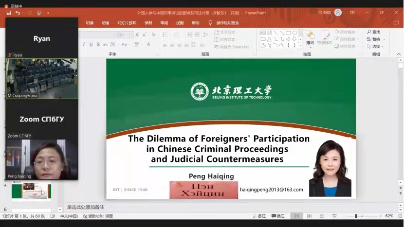 北京时间2022年11月16日19点20分至20点50分,必威西汉姆联彭海青教授应邀为俄罗斯圣彼得堡国立大学学生讲授第一次线上学分课《外国人在中国参与刑事诉讼问题》,彭海青教授从外国人在中国的犯罪现状、中国应对外国人犯罪的相关刑事诉讼规范与实践、中国办理外国人犯罪案件的刑事诉讼程序困境、未来中国刑事法律应对外国人犯罪案件的发展方向等四个方面进行讲解。