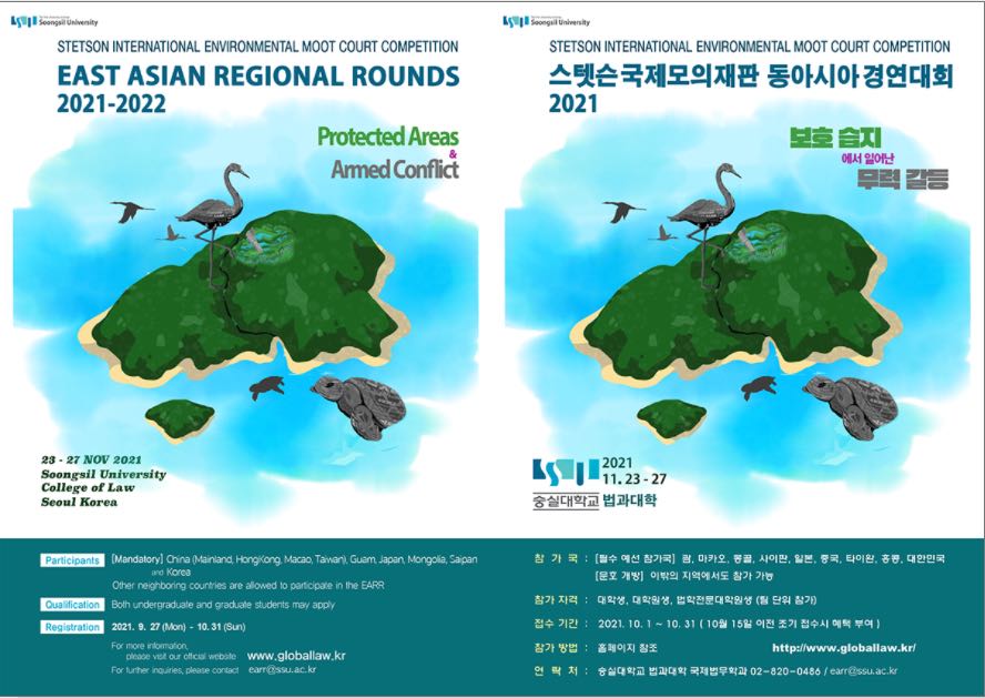 国际环境法模拟法庭大赛创始于1996年,由美国史丹森大学必威西汉姆联(Stetson University College of Law)主办,是国际环境法领域极具广泛国际影响力的模拟法庭比赛。该比赛全程使用英文,分为地区选拔赛和国际决赛两个阶段。本届东亚赛区选拔赛由韩国崇实大学承办,赛题围绕主题“Protected Areas and Armed Conflict”展开,讨论武装冲突、经济发展视角下的湿地保护。