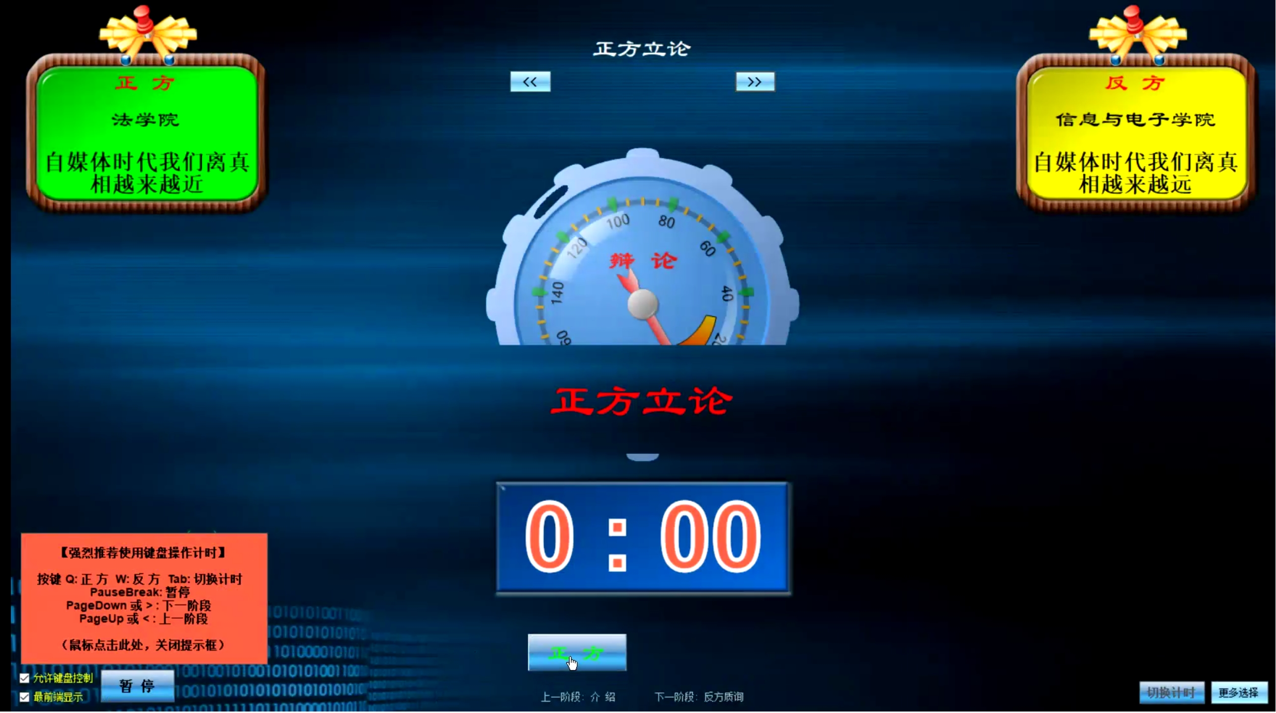 本次辩题为“自媒体时代我们离真相越来越近/远”,我院此次上场的辩手为:一辩沈梦圆,二辩李佃武,三辩张逸飞,四辩孙慧颖。我方观点是“自媒体时代我们离真相越来越近”。比赛分为开篇陈词、对辩盘问、自由辩论、总结陈词四个环节。