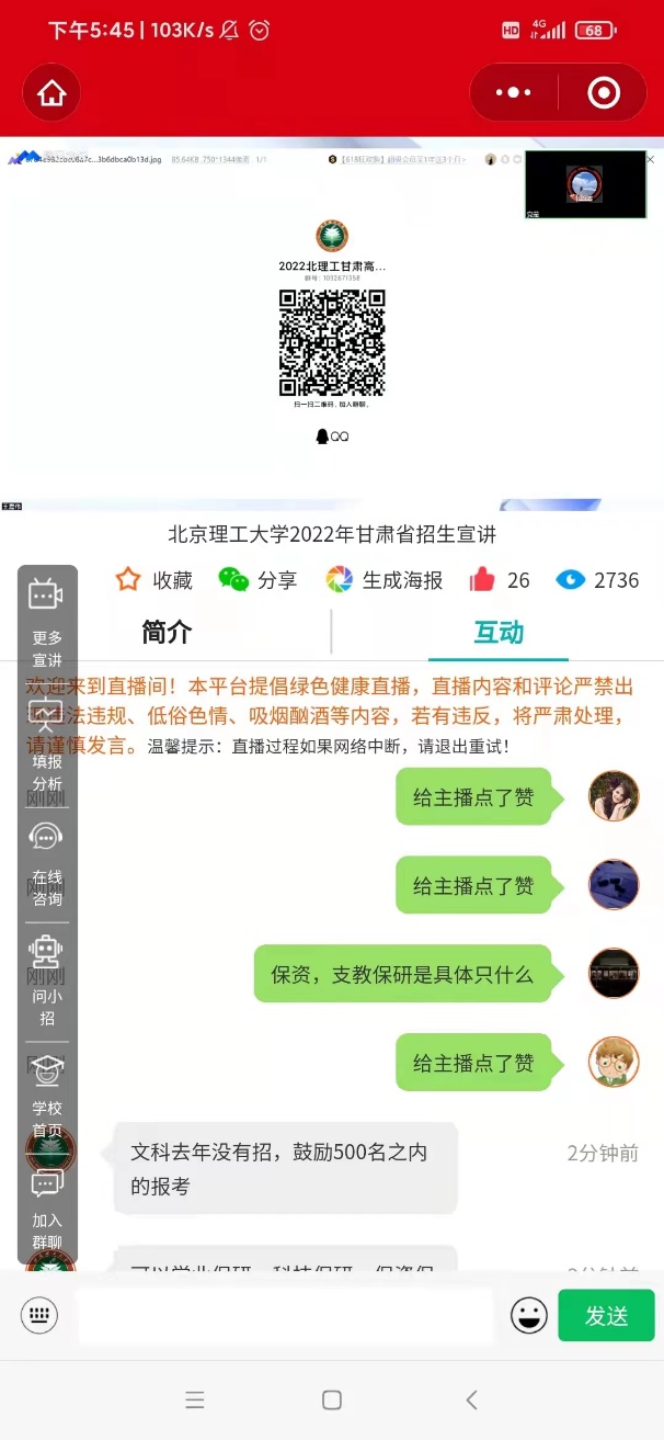 本次宣讲得到学校招生办公室的大力支持,王菲教授的生动讲解引起了考生和家长们的强烈兴趣,同学与家长纷纷在线上留言互动并加入甘肃招生宣传群。活动受到了考生及家长的广泛关注,反响热烈。