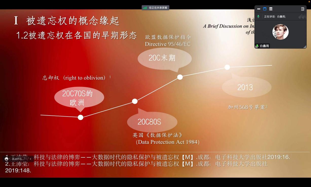 2022级法律硕士白鑫雨就“被遗忘权”进行了专题分享,他事先和同学们分享了该领域的三篇论文,这些论文涉及对“被遗忘权”的权利构造、将其本土化的必要性和制度建构等方面的研究。在进行分享的过程中,他先以“棱镜门”作为案例导入,介绍了“被遗忘权”的概念缘起和发展历程,从而引出了在大数据时代我国是否应当确立“被遗忘权”的讨论。接着,他介绍了我国引入“被遗忘权”的必要性与挑战。在汇报过程中,他从“互联网+”的不断发展与“数字圆形监狱”给个人信息保护带来挑战的背景下介绍了数字的永久记忆与流动自由与个人信息控制权间的冲突,从而引出对言论自由与被遗忘权边界的问题讨论。然后,他介绍了欧盟、美国和俄罗斯在“被遗忘权”领域的立法经验,以及我国被遗忘权的立法实践。最后,他从《民法典》和《个人信息保护法》的角度,介绍了将“被遗忘权”本土化并构建完善制度体系的展望。