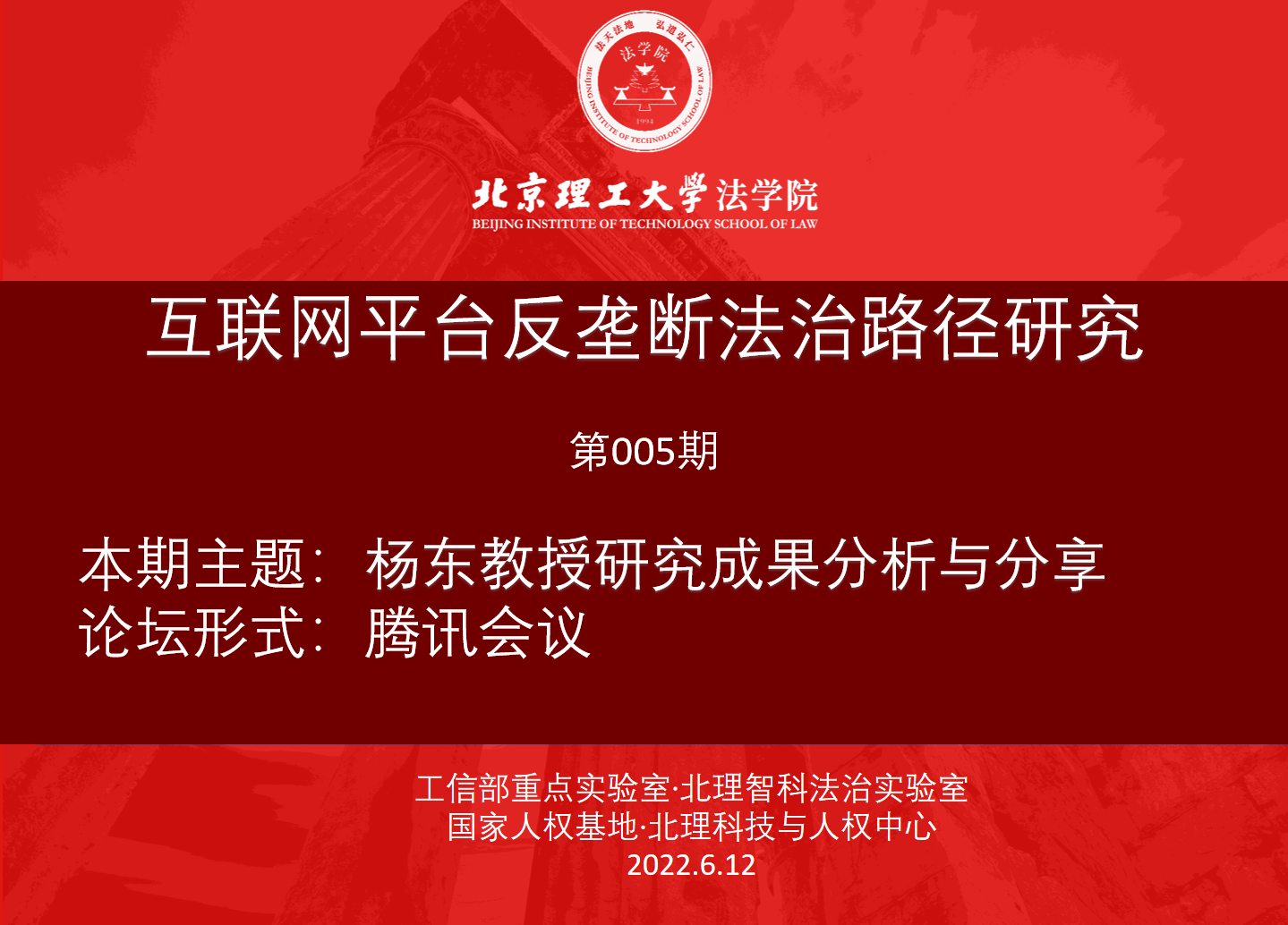 6月12日晚上,由智能科技风险法律防控工信部重点实验室和国家人权教育与培训基地BETWAY必威科技与人权研究中心共同主办的“互联网平台法律治理工作坊”第五期工作坊通过腾讯会议线上召开,本次会议的主题是“互联网平台反垄断法治路径研究”。