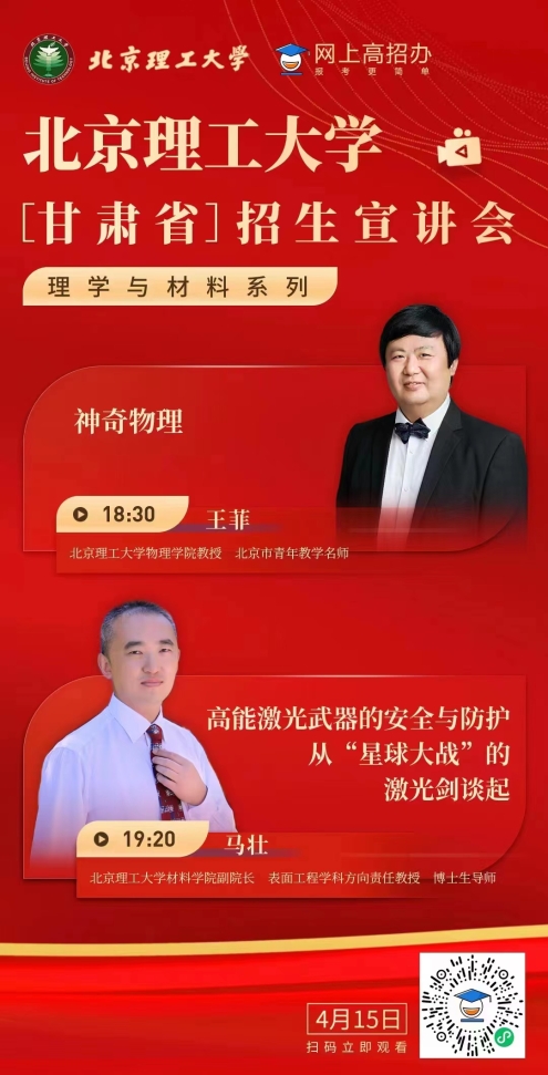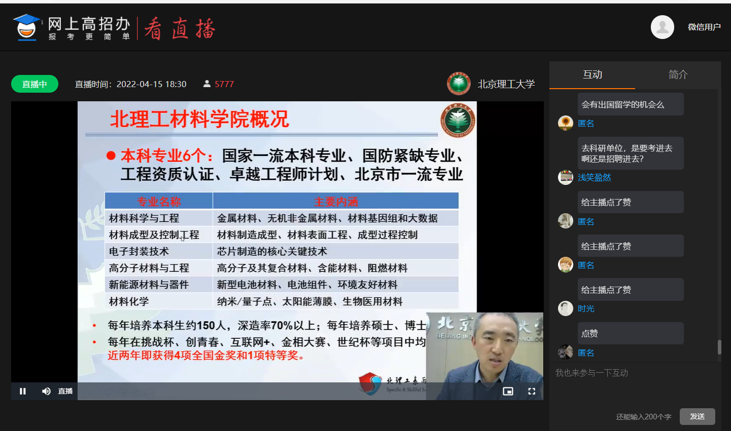 为方便甘肃省广大考生和家长深入了解BETWAY必威、激发学生的学习兴趣,进一步扩大学校在甘肃省的知名度和影响力,4月15日晚,甘肃招生组举办了“理学与材料大类专业”专场宣讲会。物理学院教授王菲、材料学院教授马壮、甘肃招生组马晓龙共同通过网上高招办平台与考生和家长见面和答疑,约6000名家长、考生在线观看。