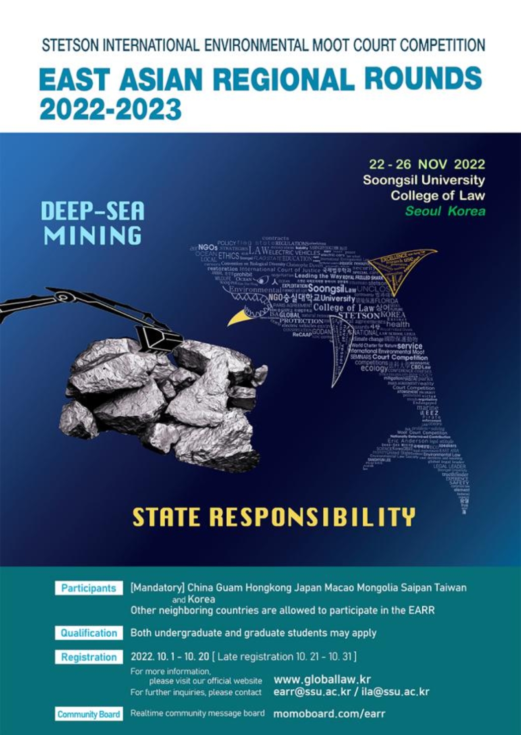 国际环境法模拟法庭大赛创始于1996年,由美国史丹森大学必威西汉姆联(Stetson University College of Law)主办,是国际环境法领域极具广泛国际影响力的模拟法庭比赛。该比赛全程使用英文,分为地区选拔赛和国际决赛两个阶段。本届东亚赛区选拔赛由韩国崇实大学承办,赛题围绕主题“Deep-sea Mining and State Responsibility”展开,讨论深海采矿与生态海盗国际法规制等海洋环境保护重要议题。