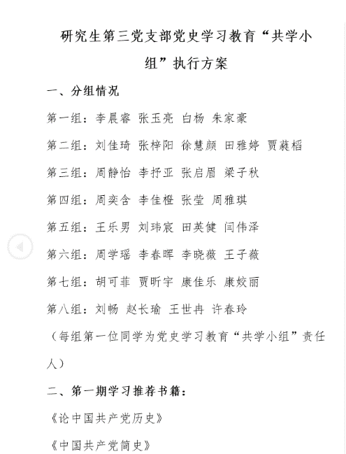 为进一步深入开展党史学习教育,贯彻落实必威西汉姆联“读懂百年路 青春心向党”党史教育“七个一”活动方案(以下简称“七个一”活动方案)精神,研究生第三党支部结合支部自身情况,广泛动员入党积极分子、共青团员加入,创设了党史学习教育“共学小组”。每个“共学小组”由学生党员骨干牵头,月初根据“七个一”活动方案选定学习书目范围,月中组织组内成员开展学习,月底进行成果展示,力求推动党史学习教育落到实处、学到深入。现将四月份学习成果进行展示。