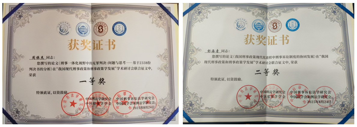 此次研讨会进行了“我国现代刑事政策和刑事政策学发展学术研讨会”联合征文评奖,评出一等奖4篇,二等奖12篇,三等奖16篇。开幕式上举行了颁奖仪式,我院周振杰撰写的《刑事一体化视野中的无罪判决:问题与思考——基于2338份判决书的分析》一文荣获一等奖;彭海青撰写的《我国刑事政策现代化进程中刑事诉讼制度的协同发展》一文荣获二等奖。