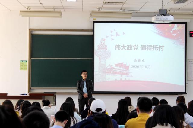 马晓龙以“伟大政党 值得托付”为主题,为在座的同学们带来了一次深刻的爱国主义教育。首先,他以中国共产党建国的来之不易,向同学们描述了第一批共产党人抛头颅洒热血,历经千辛万苦建立新中国的奋斗历史,让同学们明白了“只有中国共产党才能救中国、发展中国,是历史选择了中国共产党”这一道理。之后,他强调了同学们应该真正从思想上认识到中国共产党的伟大,要对党有信心,维护党的团结和统一;要努力学习好专业知识和思政课程,提高为人民服务的本领,扛起民族复兴的大旗。