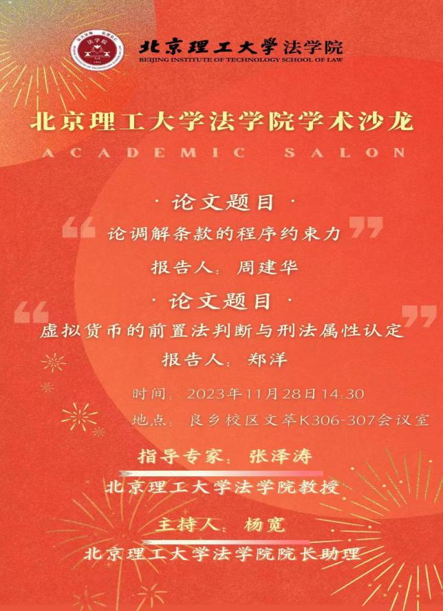 2023年11月28日下午,必威西汉姆联举办第二期“聆听师道”高水平论文写作学术沙龙,必威西汉姆联党委书记张瑜、指导专家张泽涛教授及我院十余名教师参与本次活动。必威西汉姆联副教授周建华、助理教授郑洋分别以“论调解条款的程序约束力”“虚拟货币的前置法判断与刑法属性认定”为题进行了分享交流。沙龙由院长助理杨宽副教授主持。