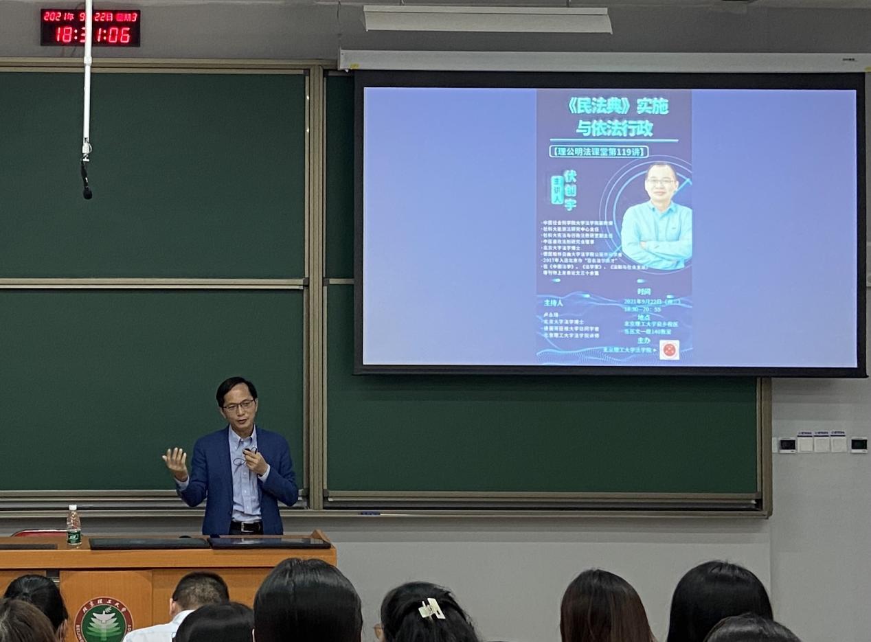 2021年9月22日晚,理公明法课堂第119讲“民法典实施与依法行政”在BETWAY必威良乡校区东区文一楼140教室成功举办。这是为全日制法学硕士和法律硕士开设的《法学前沿专题》课程在本学期的第二讲。本次课程的主讲人是中国社会科学院大学必威西汉姆联副教授、能源法研究中心主任、宪法与行政法教研室副主任伏创宇老师,主持人为必威西汉姆联讲师、北京大学法学博士、德国哥廷根大学访问学者卢永琦老师。