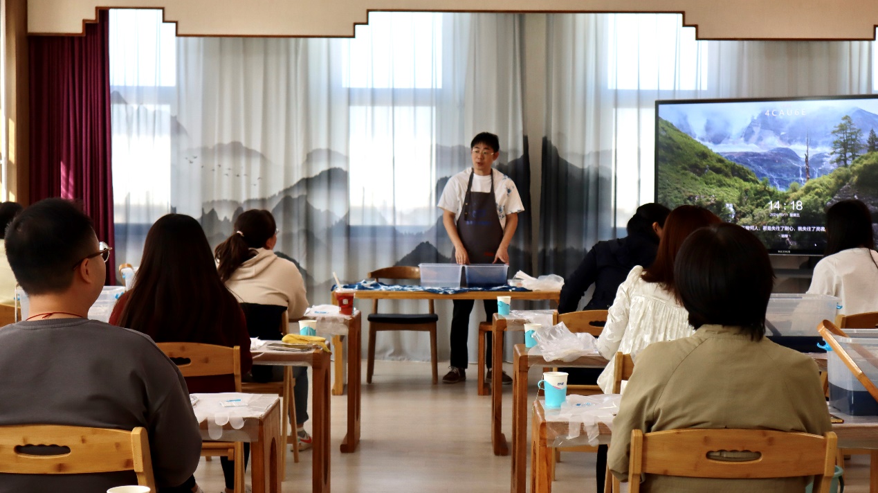 在学院工会的组织下,活动吸引了众多教职工踊跃参与。扎染导师首先为大家讲解了扎染的起源、工艺流程及其在现代设计中的应用。随后,教职工在导师的指导下,亲自动手进行扎染制作,从布料捆扎到调色染色,每一步都充满了创意和挑战。活动现场氛围轻松愉快,大家不时互相交流创意想法,分享制作心得。