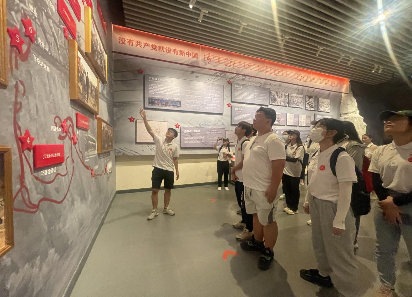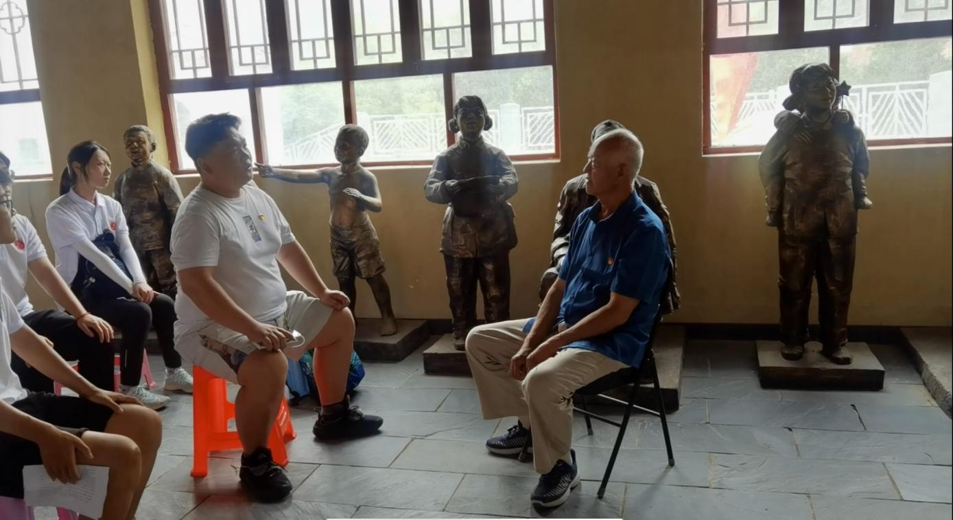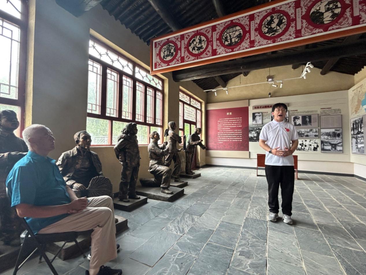 随后,同志们认真参观了没有共产党就没有新中国纪念馆,学史明志,知史励行。于航依次讲解“历史回响 人民心声”“深山里飞出不朽的歌”“让心中的歌代代传唱”主题展览,并组织集体唱响《没有共产党就没有新中国》这首雄壮激昂的红色歌曲。同志们沉浸式地接受红色革命教育,加深了对党史的理解和体悟。恰同学少年,风华正茂。在纪念馆偶遇的北京工业学院56级校友邓雪明是本次红色之旅的意外惊喜,邓爷爷鼓励同学们勇立潮头,知识报国,同学们也向邓爷爷送上了最真挚的祝福。