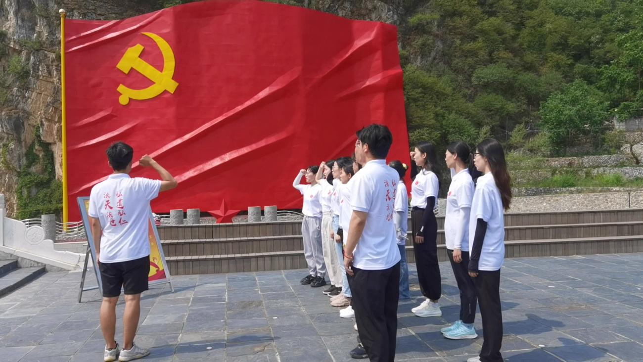 活动伊始,党支部书记于航带领同志们在960平方米的巨幅党旗前进行宣誓。“我志愿加入中国共产党,拥护党的纲领,遵守党的章程……”学生党员右手握拳庄严宣誓,铮铮誓言在山谷中回响。