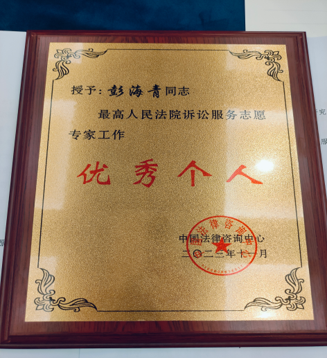 我院彭海青教授作为首批由最高人民法院委托中国法学会组织遴选的诉讼服务咨询监督员(后改称为“诉讼咨询志愿专家”)应邀出席座谈会。彭海青教授自2014年9月28日起即赴最高人民法院立案庭参与到诉讼咨询、化解社会矛盾、提供心理疏导、维护妇女儿童权益等工作中,咨询内容涉及侵权损害赔偿纠纷、房屋拆迁补偿纠纷、故意伤害案件、执行程序纠纷、劳动纠纷等各种问题,工作认真勤恳,表现优异,被授予“优秀个人”称号,并接受了最高人民法院颁发的为期五年的新一期聘书。