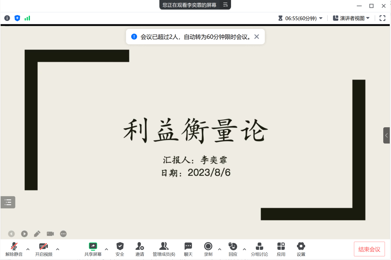 2023年8月6日晚,必威西汉姆联七位民商法专业研究生举办了暑期第三次读书会。本次读书会以线上的形式开展,大家依次分享了近两周阅读的书目,并就“利益衡量论”这一法律制度进行了主题学习和讨论。