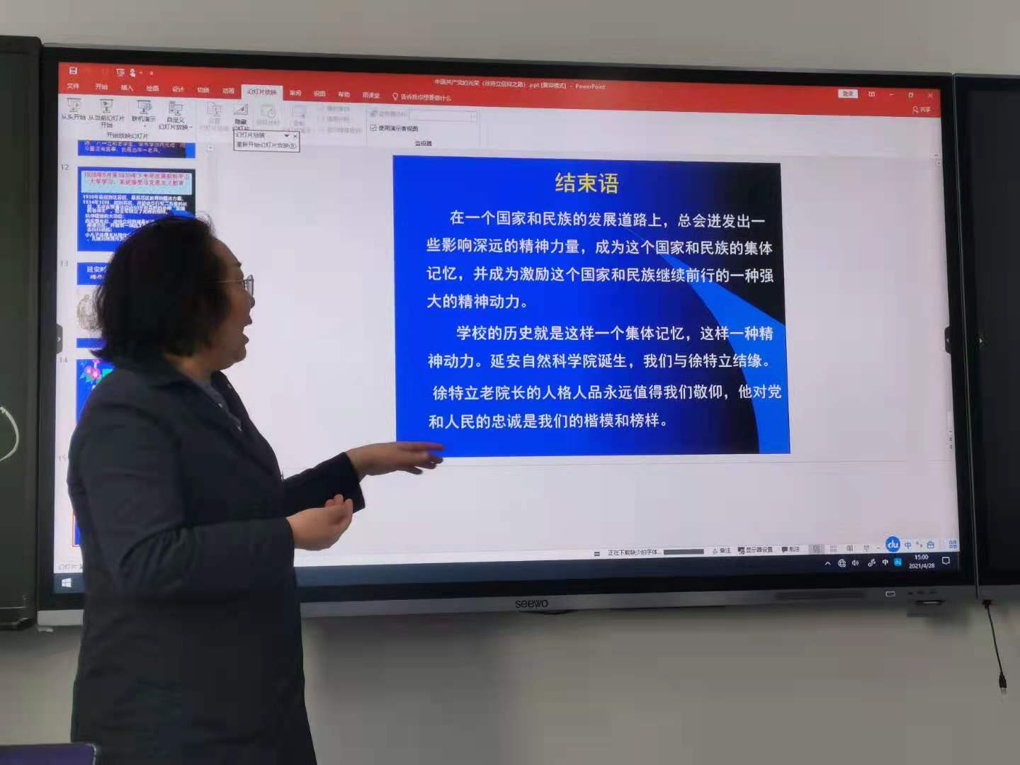 郑老师指出,在一个国家和民族的发展道路上,总会迸发出一些影响深远的精神力量,成为这个国家和民族的集体记忆,并成为激励这个国家和民族继续前行的一种强大精神动力。校史正是这样一个集体记忆,这样一种精神动力。延安自然科学院诞生,我们与徐特立结缘。徐特立老院长的人格人品永远值得我们敬仰,他对党和人民的忠诚是我们的楷模和榜样。