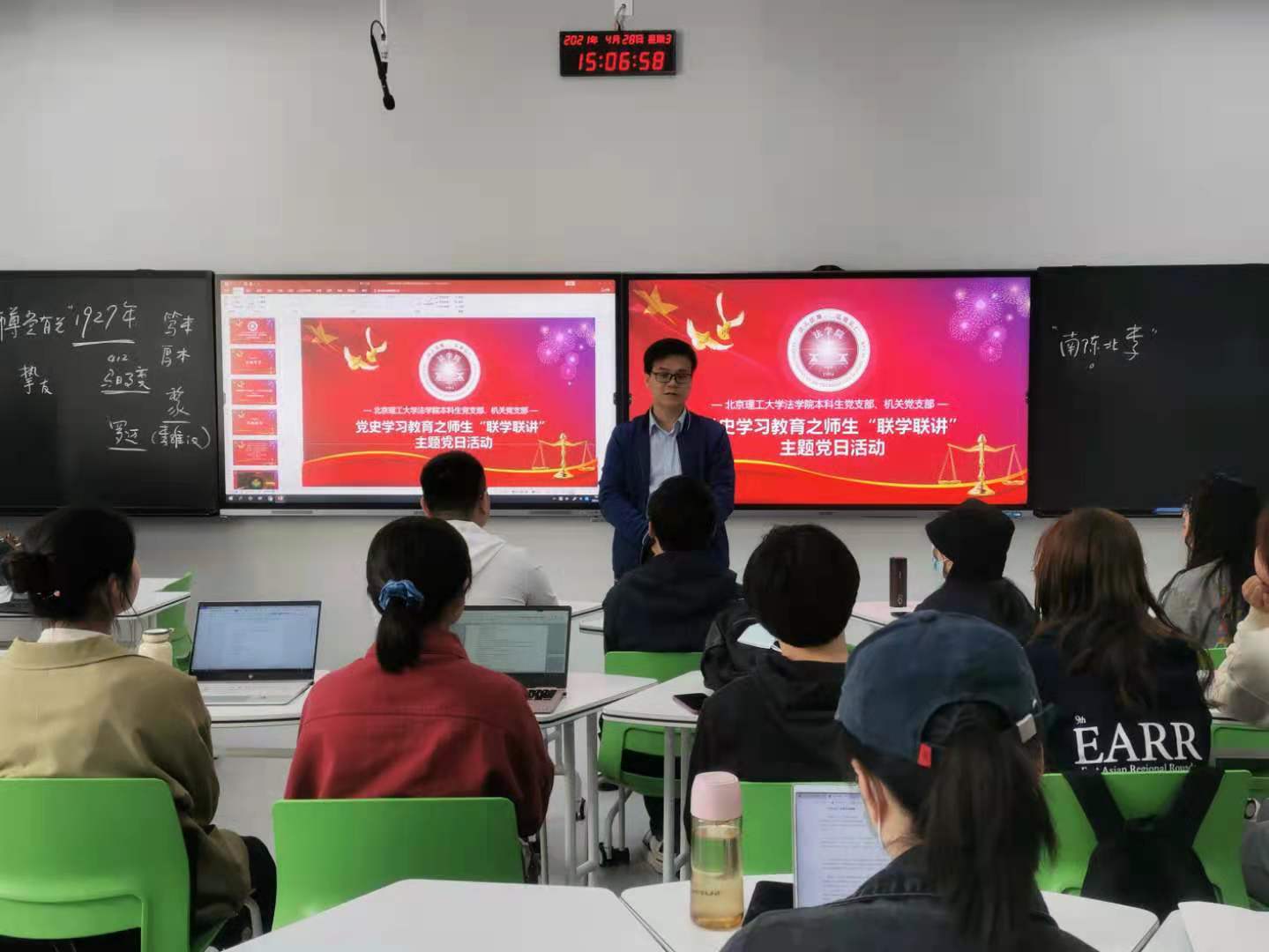 百年峥嵘岁月,传承红色基因,追寻历史足迹,讲述赤诚初心。为进一步提升党史学习教育实效,激励支部成员进一步增强历史责任感和时代使命感,做到学史明志、以史育人,必威西汉姆联本科生党支部于2021年4月28日下午14时,在良乡校区文教北楼101教室开展了党史学习教育师生“联学联讲”主题党日活动。