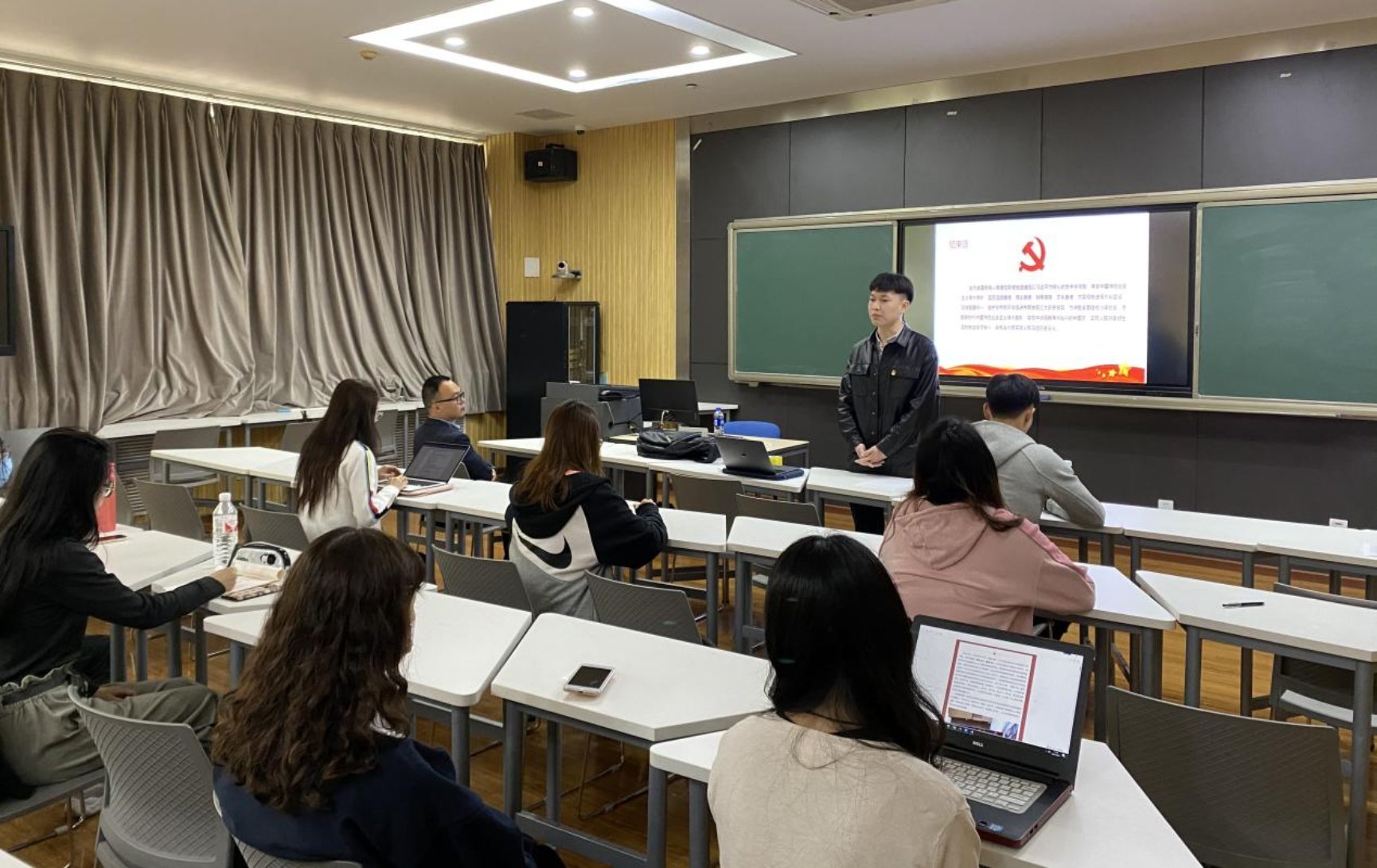 首先为民商法所党支部书记付俊伟同志讲授党课。付老师从中国共产党领导的革命到社会主义建设等分阶段对党的历史进行了详细的讲解。并强调全党全国各族人民要更加紧密的团结在以习近平同志为核心的党中央周围,高举中国特色社会主义伟大旗帜,坚定道路自信,理论自信,制度自信,文化自信,为实现推进现代化建设,完成祖国统一,维护世界和平与促进共同发展贡献属于我们青年一代的力量。在党史授课结束后,付老师还结合自己留学的亲身经历,对比近几年国内和国外的发展态势向支部党员同志讲解了中国发展之迅速,付老师认为中国之所以能够迅速发展是因为中国共产党的领导和我国的制度优势,当代青年生活在一个和平与发展的年代,更是要努力学习为党和国家的事业而奋斗。