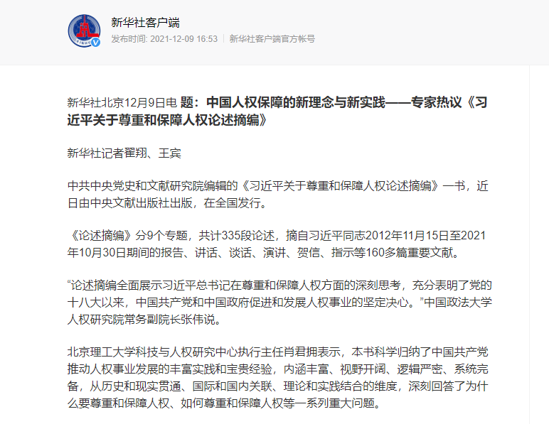 【新华社】北理工必威西汉姆联肖君拥教授就《习近平关于尊重和保障人权论述摘编》相关问题接受新华社记者采访2021-12-10 -