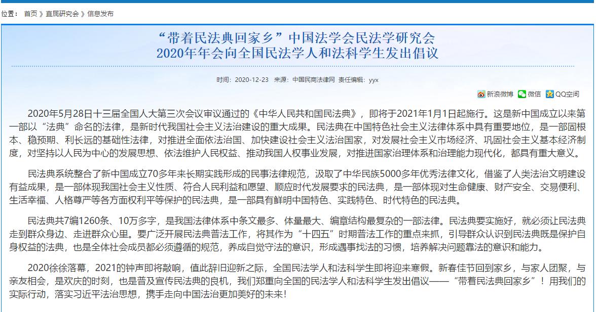 【中国法学会】“带着民法典回家乡”中国法学会民法学研究会2020年年会向全国民法学人和法科学生发出倡议2020-12-24 -