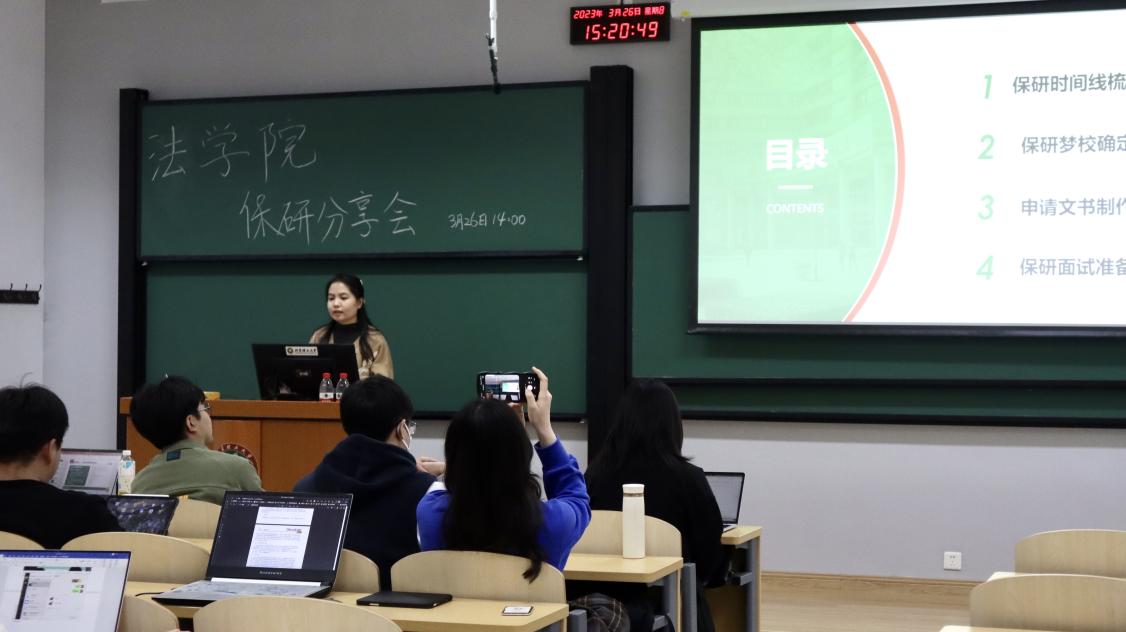之后,保研至中国政法大学环境法专业的优秀同学齐静怡给大家分享《法学外保上岸经验指北》,就保研时间线梳理、保研梦校确定、申请文书制作以及保研面试解读做了极为详细的阐述。她告诉大家许多十分实用的小tips,比如关注一些小众且精辟的公众号以了解第一手资讯;很多面试问题可以一答多问,准备一个主题然后现场稍作改编嵌套等等,干货满满。